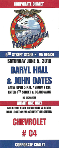It was year 6 of the Patriotic Festival. The Patriotic Festival is an annual event which takes place in Virginia Beach. I think we've gone at least three if not four of the years. I didn't make a page for the other year or two. I don't know know why... the Patriotic festival is basically honoring our military. Every year, one deserving man or woman from each branch of the US military is honored for their self-sacrifice and honor they bring to themselves, their branch of service and the US in general. At the event, they get up on stage and we hear about what they did. Many are injured. The radio stations, the USO are the emcees of the event. The crowd comes mainly for the national entertainment, which is always free to the public. This year it was several bands but we only went the day Hall and Oates were playing. Other bands were: Uncle Kracker and Jason Aldean. Hall and Oates were good but there were some mechanical problems with the keyboard and I heard John Oates change the lyrics of a couple songs. The warm up band was Guava Jam. I appreciated Hall and Oates played a lot of their hits (not all though). I did buy a CD but never got a chance to get it signed. Or even try. We were not as close as I'd of liked. They set up the beach differently this year. They put out SEAT and charged 50.00 a ticket so people would be closer to the stage but there were so many seats you were paying for nothing really. NOT worth it. We had VIP seating in the Chevy tent which was not that great as it was far but at least we got free food and drinks. I am losing my site, so I cannot see well and being close is important to me. Oh well. Not this time I guess. The festival has some tents set up to buy food and several vendors/sponsors want you to come see them like Chevy, Geico, banks and such. Of course there are carnival rides and shops and such along that strip. Others swim or go boating/parasailing or whatever. Parking will cost you about 6-20 dollars for the night depending where your park. Food is NOT good there. Prices pretty high for the quality. Bring water bottles, sunscreen, a towel to wipe your feet off, money, camera and to get a good seat, you need to get there WAY early (three hours will be the earliest they'll let you set up). If you do this, you'll be bored, so bring a book to read or something. You are NOT allowed coolers or picnic foods. Members of Hall and Oates band include: Charles DeChant, Mike Braun, Eliot Lewis, Zev Katz, Everett Bradley, Paul Pesco.