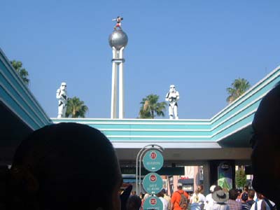 May 31st 2003, Day Two: Up at 6:00-6:30 AM and down to breakfast at the hotel restaurant (only thing available for a long ways). GREAT breakfast buffet, but is a bit expensive at $14 a person. Cool to "bill it to the room". On the free shuttle by 8:30 AM to the same ticket/transportation center where we take a free Disney bus to MGM-Studios which has "Star Wars Weekends" going on. As we are entering the park's turnstiles, Stormtroopers are being funny, making fun of the tourists snapping photos Seeing the troopers makes me excited and now I am expecting to see more characters. My agenda, thanks to the forewarning of a phone call from a Disney Rep before I left, I know that I must get an armband to get an autograph. So the only thing I planned this day was to get to the park when it opened and get through the gate and get that armband. I arrive and we make it there. We have to get in line to get an armband and you can only do one because after about the first hundred people, there will be no more. Dividing and conquering, I go for Silas Carson, the more elusive of the two celebs and Scott gets Mike Quinn. This way, I can have the set of autographs for the day. I am number 57 and I think Scott is 40 something for Mike, but for the AFTERNOON signing! If I get my band and go to Mike's line and Scott in Silas' line, and I probably will be on what they call "standby". That's just if some of the people don't show on time because they are in lines on rides or something, I can get one then by waiting and hoping. They give you a number for that as well and unless you are like 1-10, you might as well forget it. Signings are twice a day for ONE hour. So we are content to just get one of each. They pass out at that time a limited supply of pre-printed and auto-penned sigs. So if you see these on Ebay, please inquire if the person got the sig in person or if it was signed in marker or pen. If they say pen, then that's the autopen. The differences are obvious, but only when seen in person; not online! Now, while we wait to come back for our 2:45 given time, we head out and visit the Drew Carey event entitled, "Sounds Dangerous". Here, you sit in a theatre with headphone on. It's a sound experience, where surround sound supposedly makes you think you are actually watching Drew solve a crime "live". In actuality, this was the weakest thing of the day for both of us. I wasn't too impressed. I next head to the Star Tours ride, which is what everyone keeps talking about. Hearing they may remove this, I came for this reason. I like the ride and though not supposed to take photos inside, I do snap a couple. This is a 3D Adventure where you are in a shuttle and it moves, but mostly the big screen and movement makes you feel like you are going through an asteroid field etc. It was a lot of fun. Pee Wee Herman is the voice of Rex, the "tour operator droid" who is inept and why you go on the scary adventure. We leave and spend time snapping photos of Star Wars characters and things in the park. I decide I had enough of Star Wars for a bit and we head to "Honey I Shrunk the Kids Movie set adventure" This is not a ride, but a park where kids can climb and explore. And Scott is told they are giving out free Star Wars card games and goes to get me one. From the playground we spied the entrance to the MGM-Studios Backlot Tour. While going on that tour (see other page), we see some props outside and inside the building we passed through before getting on the train or whatever it was. On the tour, you see some large vehicles too large to store and that won't be used again (Terminator Tanker truck, a couple Star Wars vehicles, some stuff from Pearl Harbor and other films. Buildings included half a dozen house facades that were used to make opening shots of TV shows like "Golden Girls" and the Richard Mulligan show "Empty Nest". After this, we break for eating (Cheeseburgers and fries) and get a fast pass for the "Who Wants to be a Millionaire Show". While waiting for the fast pass to take effect, we are tired and sit for a long period, where I spy Mini Mouse and Pluto signing autographs and taking photos with the wee ones. But we couldn't find Mickey until we realized, the star got to be in air conditioning...and I snapped a quick photo of him. Finally, we are inside and we realize it's the size of an actual set and it's a duplicate set with fast finger rounds and audience participation pads. You can poll the audience. Alas, I'd been hearing reports of a Star Wars Who Wants to be a millionaire, but not this day at this time anyway! I was mad till I realized I got all but the very last question right and even so, never made it to the top ten. I am not fast enough! The host is probably going to be on a sitcom or in a couple mediocre films. He's the personality for it. I snap two photos from the who wants to be a millionaire set, which you were not allowed to take. An actual contestant from the audience even got to "Phone a complete Stranger" who just so happened to be someone outside the in the park! And the two contestants we saw won both 32,000 level (points not dollars) and got a set of collectible 10 Disney Pins and a hat. We then head to "The Great Movie Ride" which looks cool, but it's closed. We get some drinks and realize it's about 2:15 PM and signing is at 3 and we need to be there by 2:45... so we head there and wait. While waiting, they are begging us to take another card game (they can't get rid of them fast enough) so we get another. I realize my Park Hopper pass (which is good for two more days and costs about $200, is GONE!!!!). Scott takes my ID and at the urging of one Star Wars fan and a park worker, that I should go to guest services. Scott, not wanting me to miss Silas and feeling bad because I am sweaty and blistered on my feet, takes my ID and goes. The park just gave him another after looking in the computer to see that we've been using these passes in sequence on fast pass rides! It is using the fa