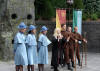Left to right: 1) The Frog Choir 2) The Frog Choir was lead by a very upbeat conductor 3) Frog Choir 4) Frog Choir sings in harmony well. We then waited for the Beauxbaton's and Durmstrang students to do their show. The Beauxbaton's did a little dance while the Durmstrang students put on a little choreographed show with their walking sticks. Here are some photos: Left to right: 1) The students of Durmstrang and Beauxbaton's come in for the Tri-wizard Spirit Rally 2) A Beauxbaton student does a little dance 3) The students get ready for the rally 4) Beauxbaton's do a choreographed dance at the "Tri-wizard Spirit Rally"