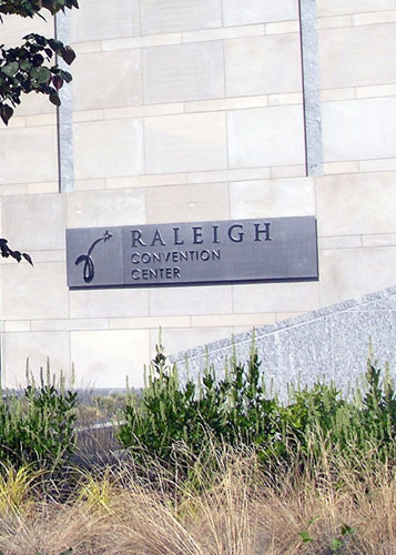 Left to right: 1) Convention Center plaque on building 2) The convention Center where we entered 3) The front of the Convention center 4) a Statue of Sir Walter Raleigh (which I guess Raleigh is named for).